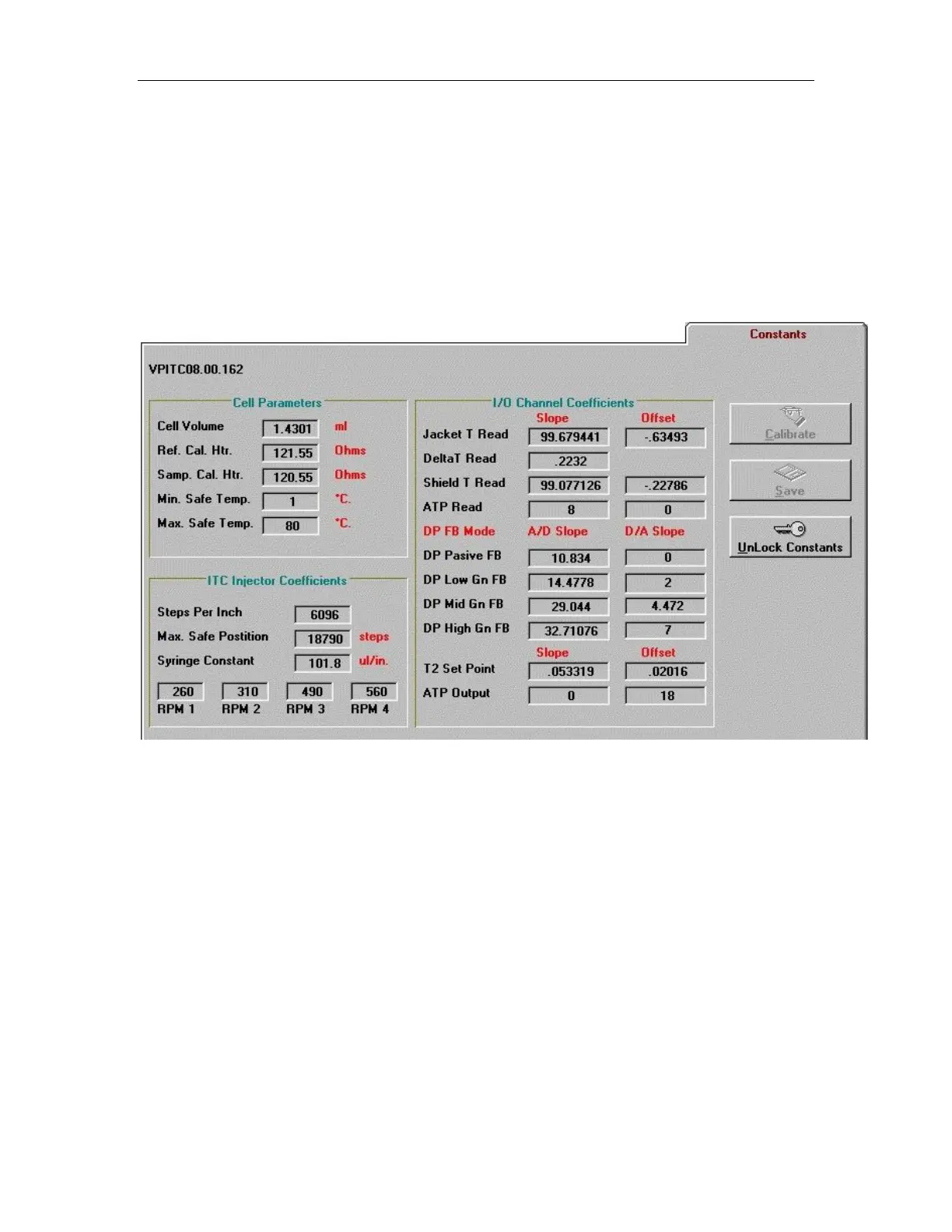 Shown below are calibration constants that are typical of the VP-ITC. This window is password