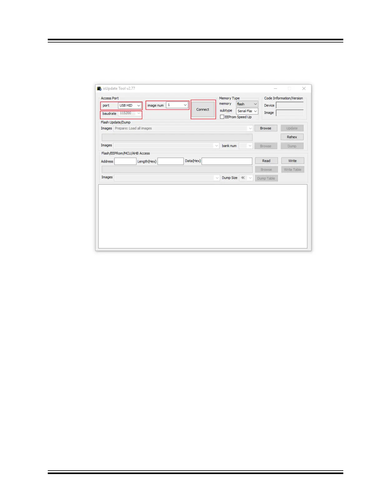 4. Open the isUpdate tool. Select the port as USB HID, set the baud rate to 115200, and image num to 1 as