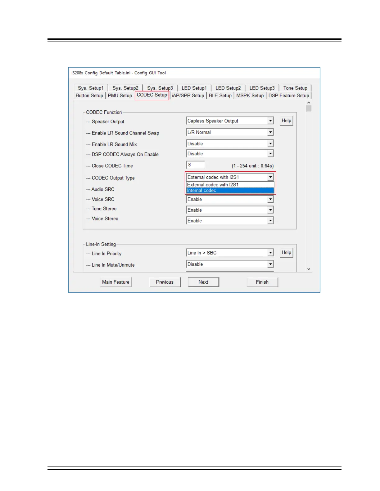 8. In the CODEC Setup tab, select Internal codec from the “CODEC Output Type” drop-down menu.