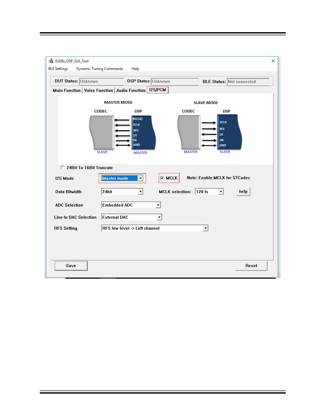 12. In the I2S/PCM tab, the user can set the required parameters as highlighted in the following figure.
