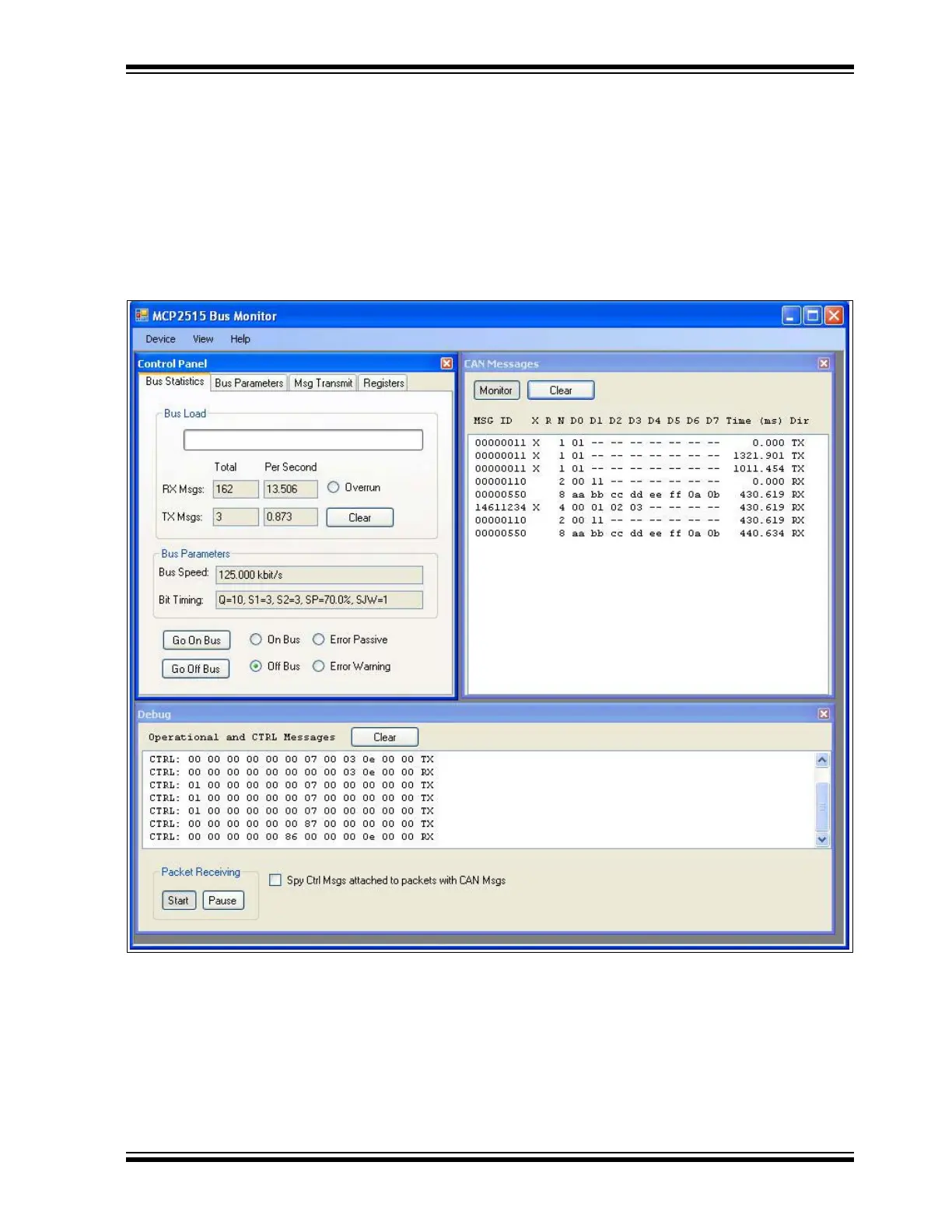 The GUI consists of thee main panels: Control Panel, CAN Messages, and Debug. The