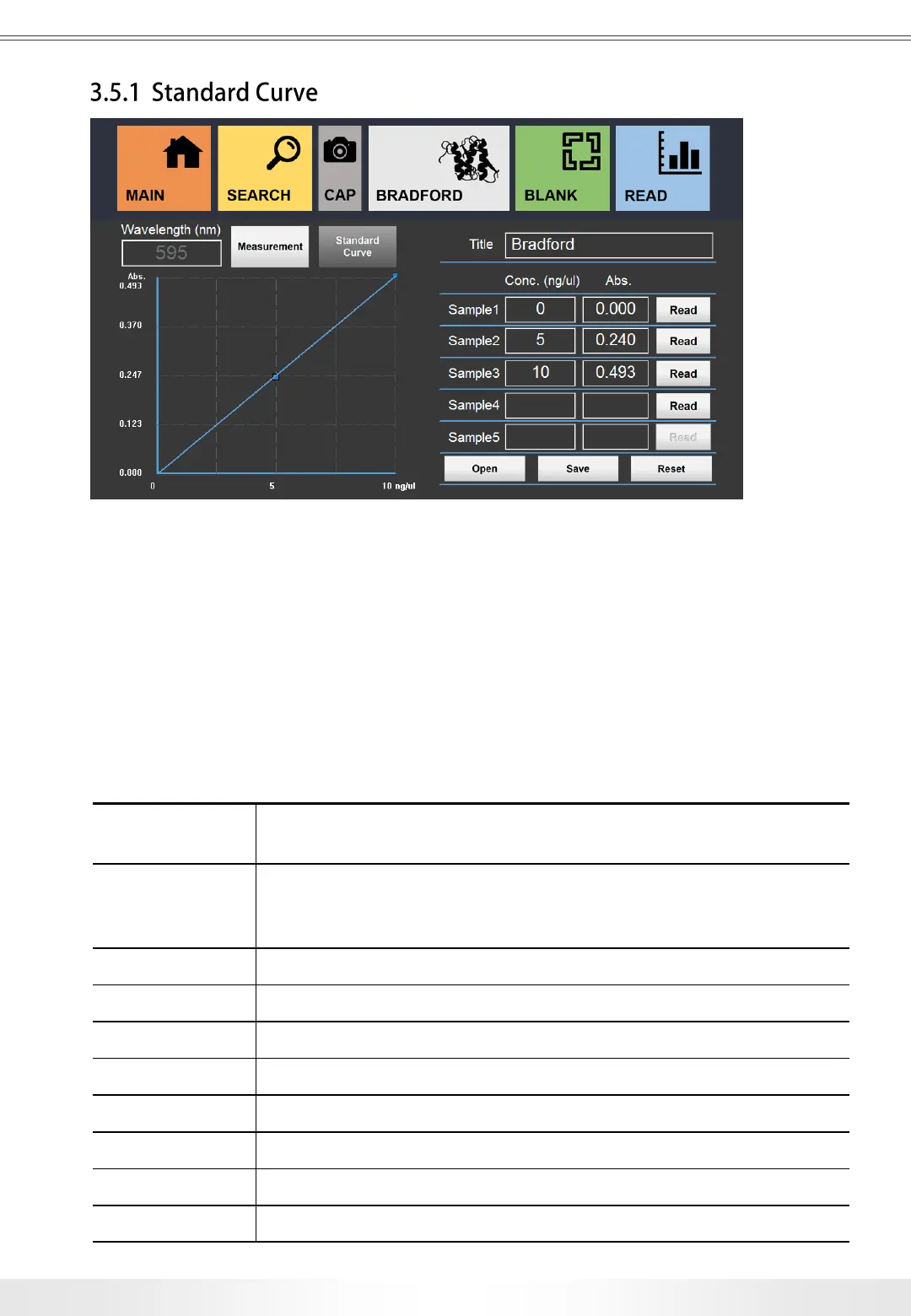 Standard Curve data by touching the Save, Open, and Reset buttons.