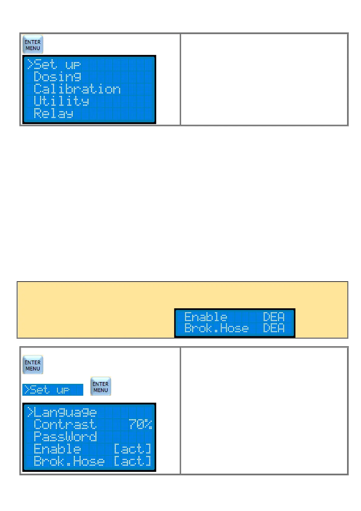 The Language, the display contrast, the safety Password, the activation or deactivativation of the Enable input (dosing