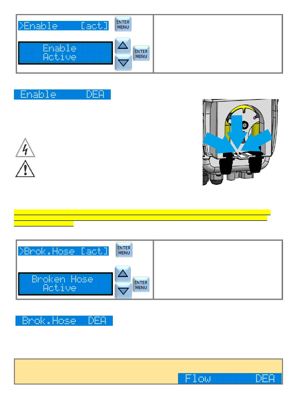 come out. When the broken hose alarm starts, it stops the dosage and the green led