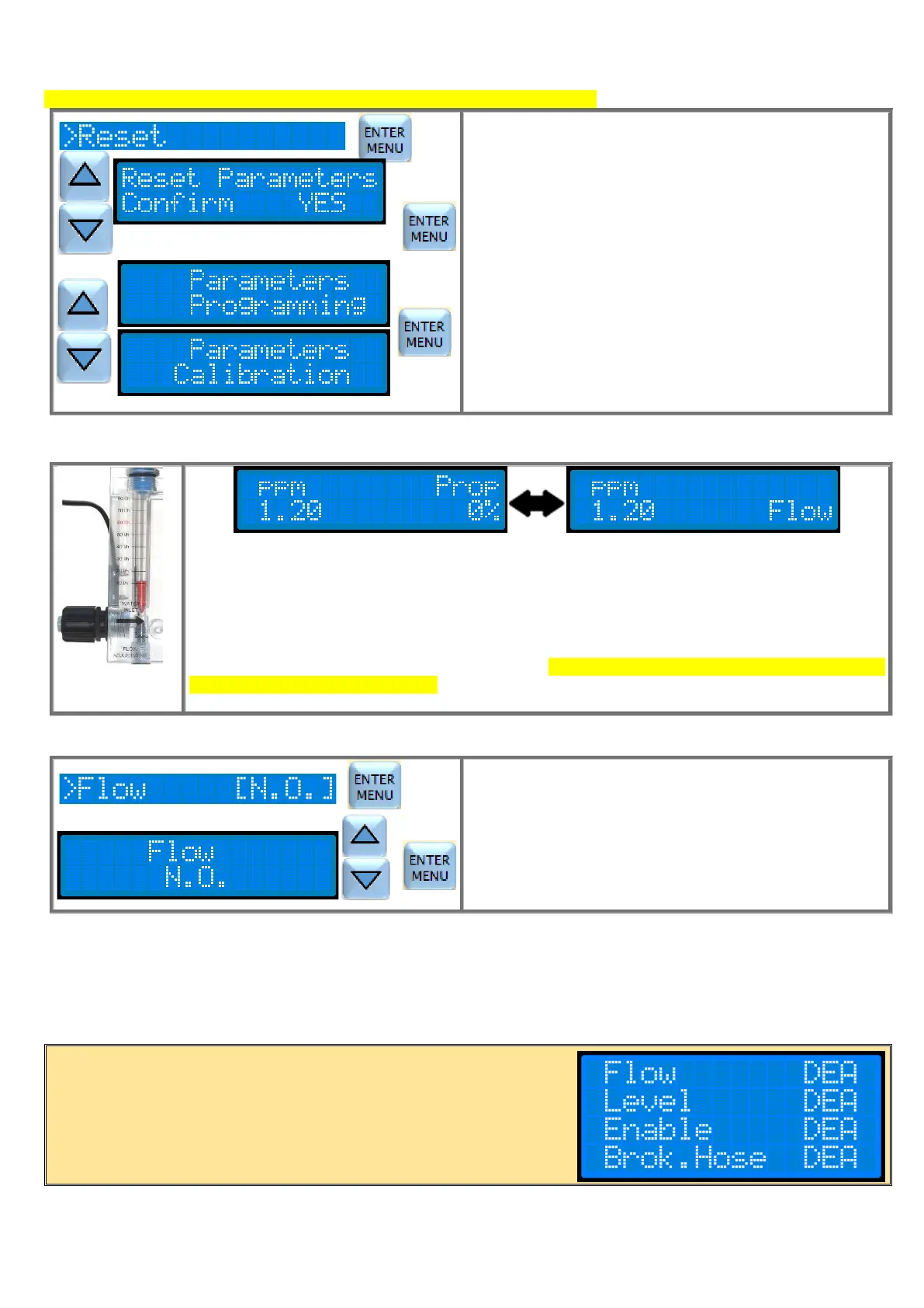 NOTE: The flow alarm resets the counting of the Alarm Time.