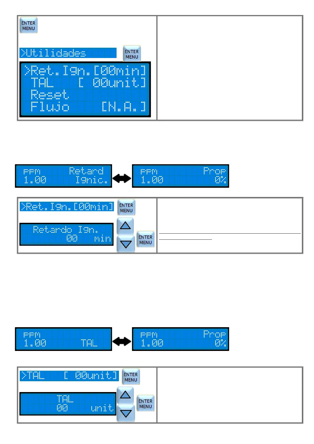 encendido y al final de una alarma de flujo para dosificar el químico. Durante este tiempo, el mensaje "Retard Ignic." se