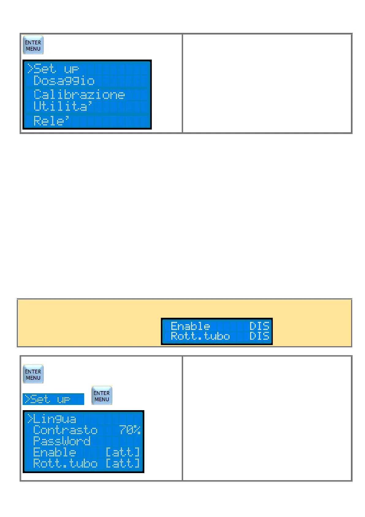 scegliere la Lingua, il contrasto del display, la Password di sicurezza, di attivare o disattivare l’ingresso di Enable