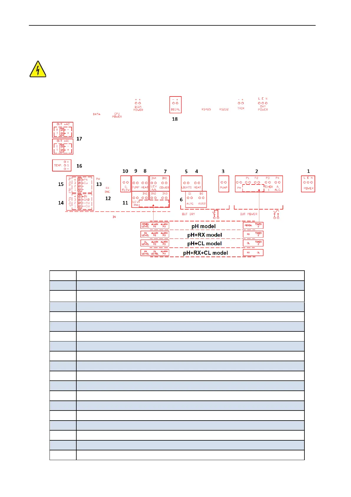 Output power connection (230 Vac) for pH, Rx, Cl, Algicide and auxiliary pump. (PH, P1,P2,P3,P4). ( Max 10A,