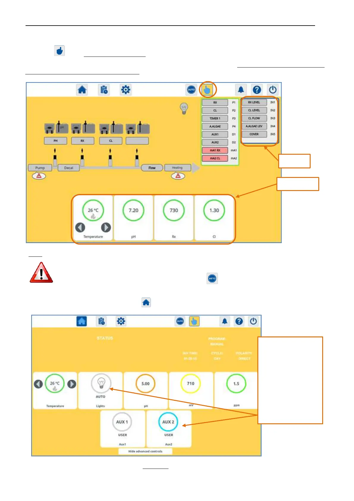 When the background of the page is yellow, with a short press inside the Lights, Aux1 and Aux2 circle, you can choose to manually