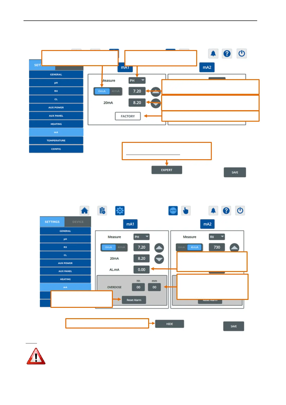 It is possible (OPTIONAL) to add up to 2 milliamperes (mA) outputs to connect the Microdos Pooltec to regulation pumps that are