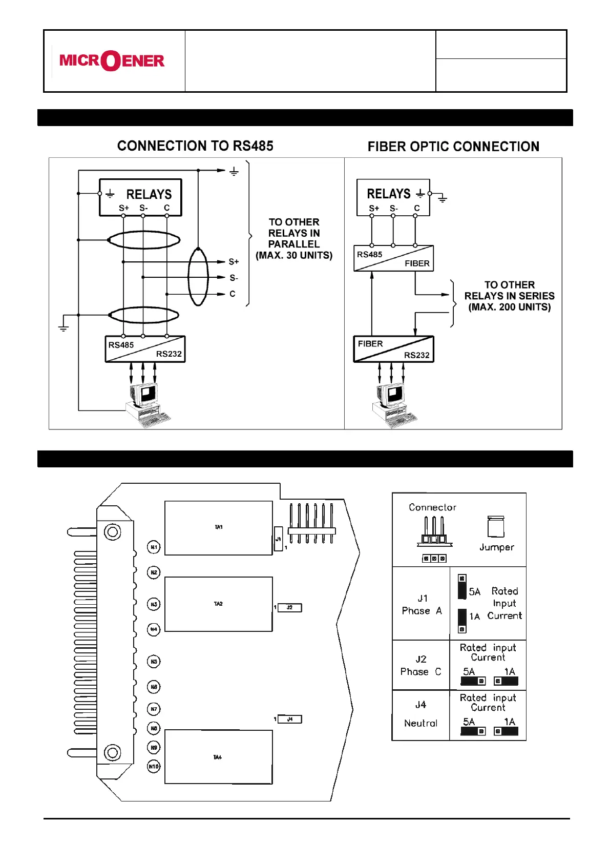 MICROENER MM30-D - Serial Communication Wiring and Input Configuration; RS485 and Fiber Optic Connections; Phase Current Input Configuration