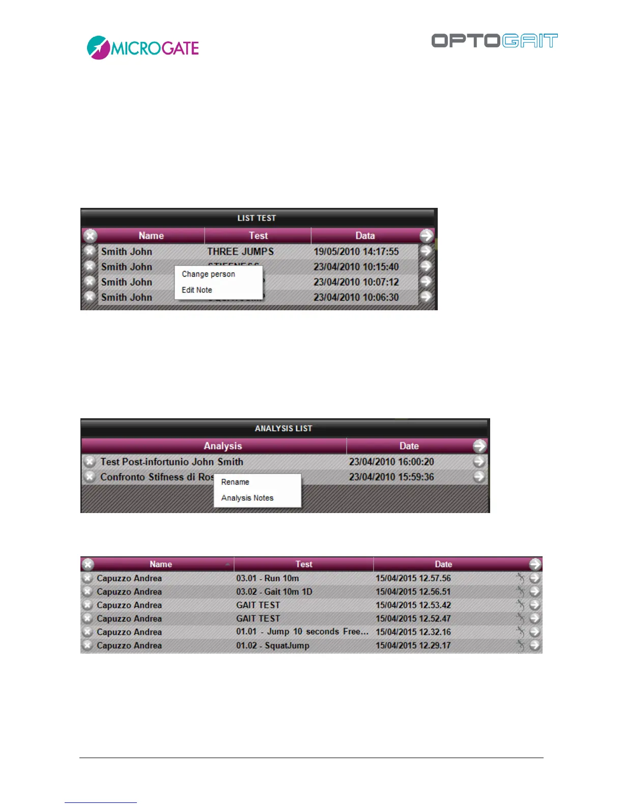 From the test list it is possible to perform two operations by RIGHT CLICKING on one test line. More