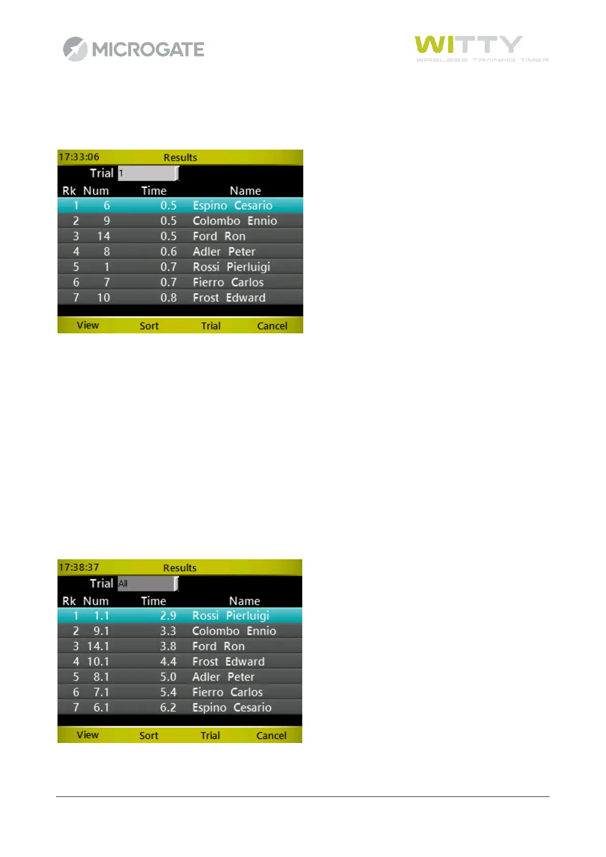 Display the raking of the current Trial (or of a given trial). A certain athlete's test can be displayed and the