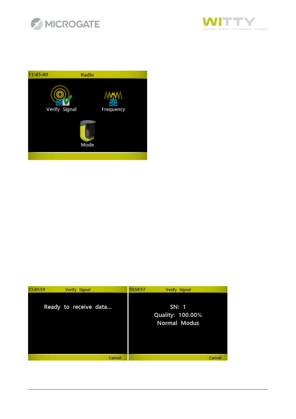 starts: besides signal quality percentage, the recorded bib number and the Radio Power mode