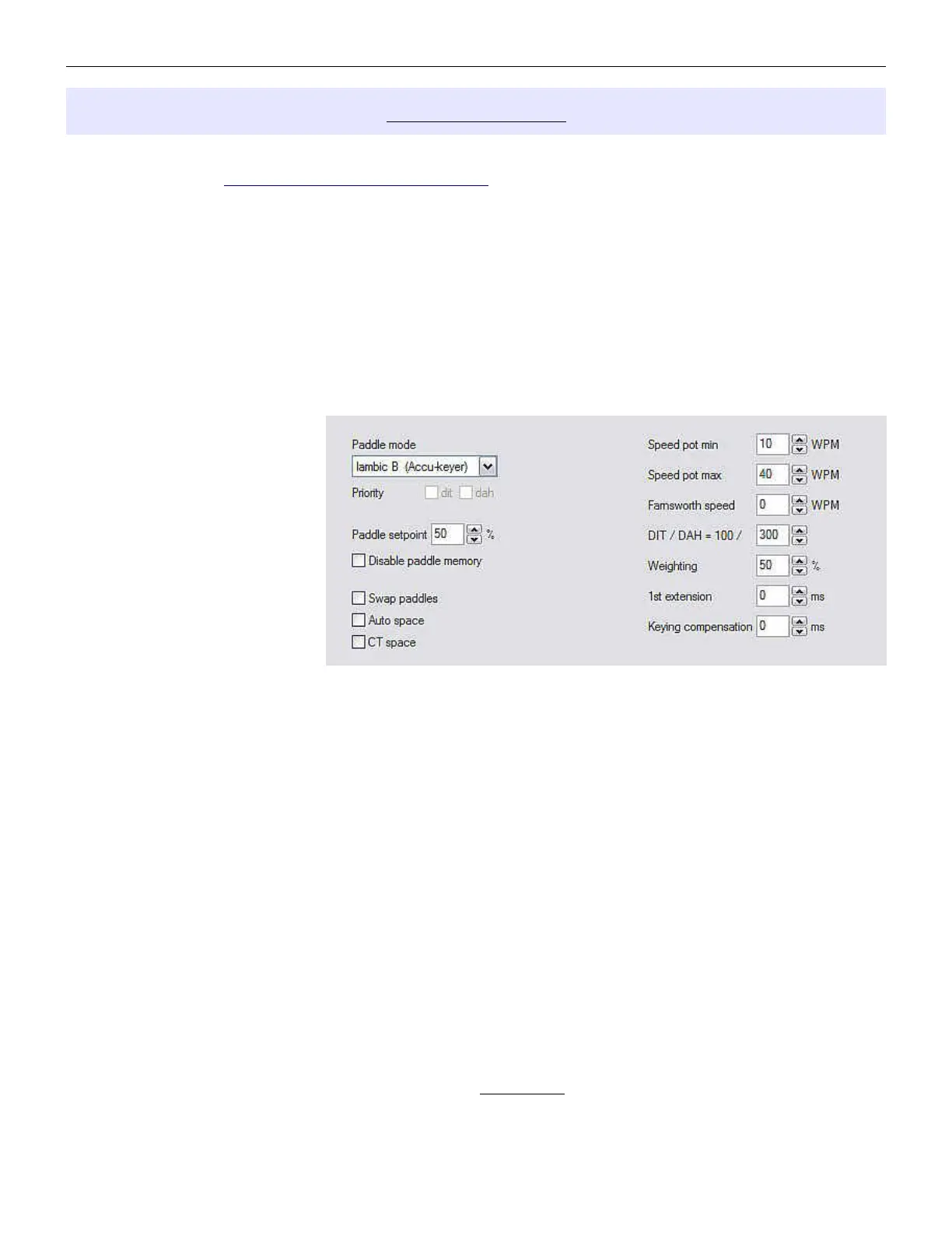 Disable paddle memory – When checked, DIT (or DAH) insertion is disabled.