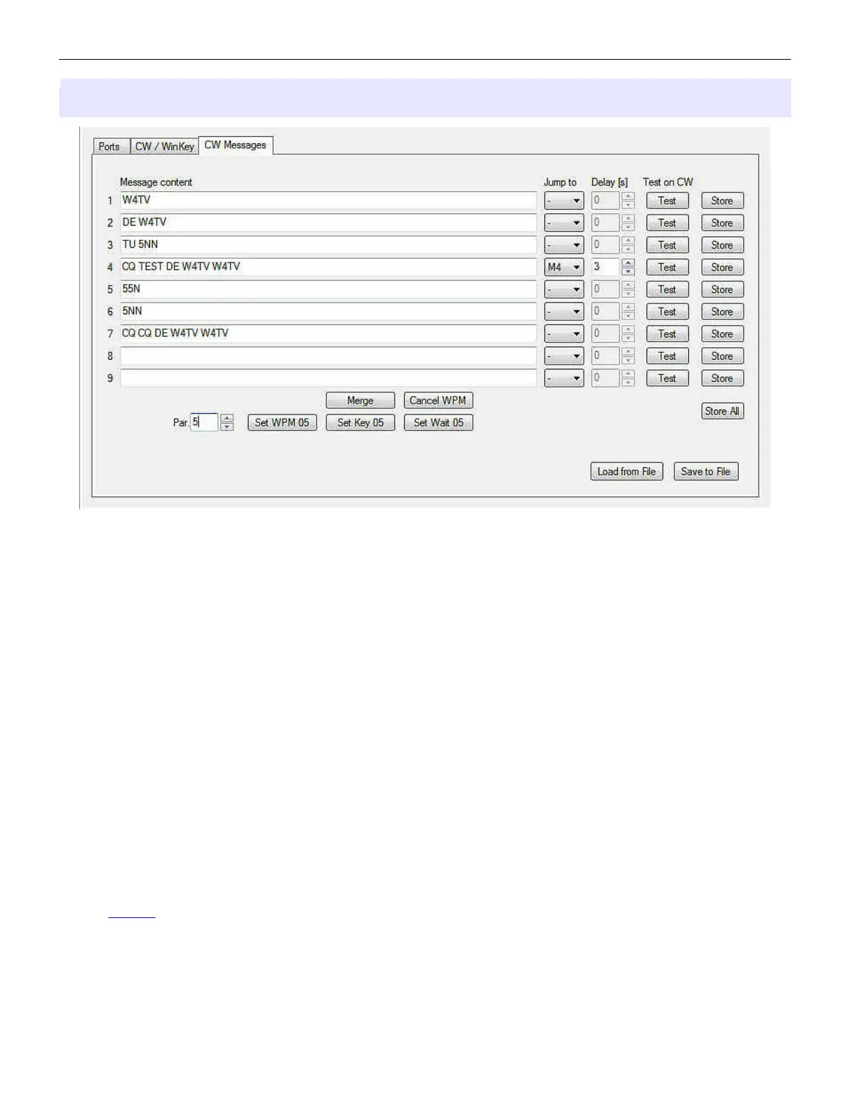 CW Keyer supports nine messages of up to 50 characters each which can be stored are stored in non-