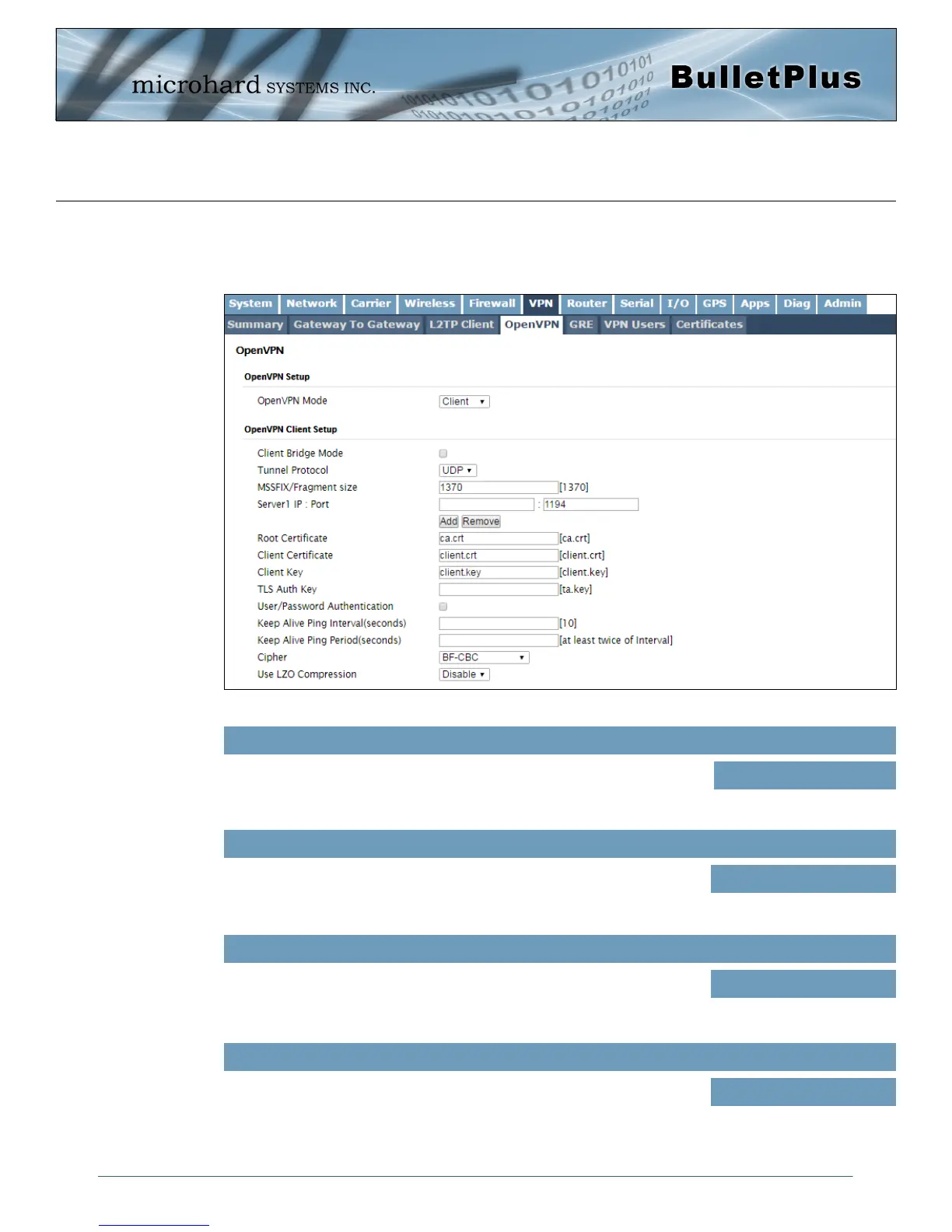 The BulletPlus supports OpenVPN and can be configured as a Server or a Client. This section outlines the