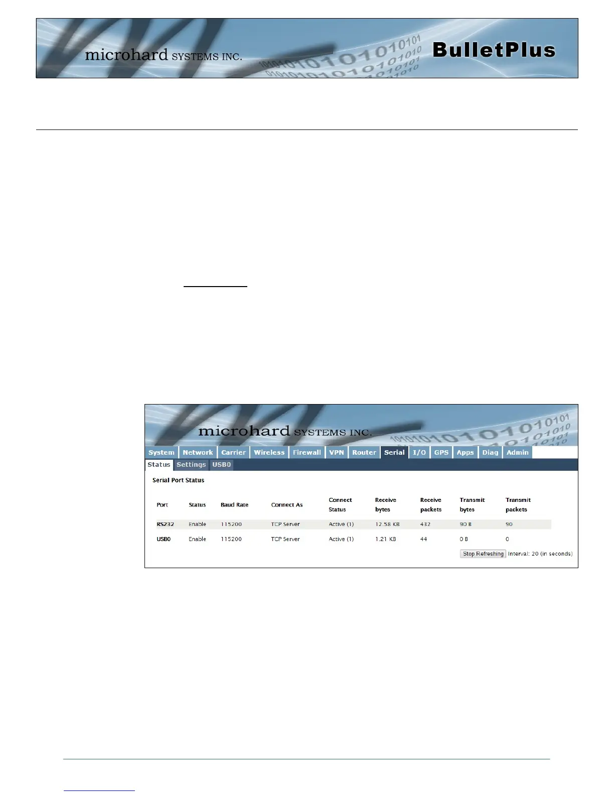 The Serial > Status menu presents a summary of the RS232 Serial Data Port located on the side of the