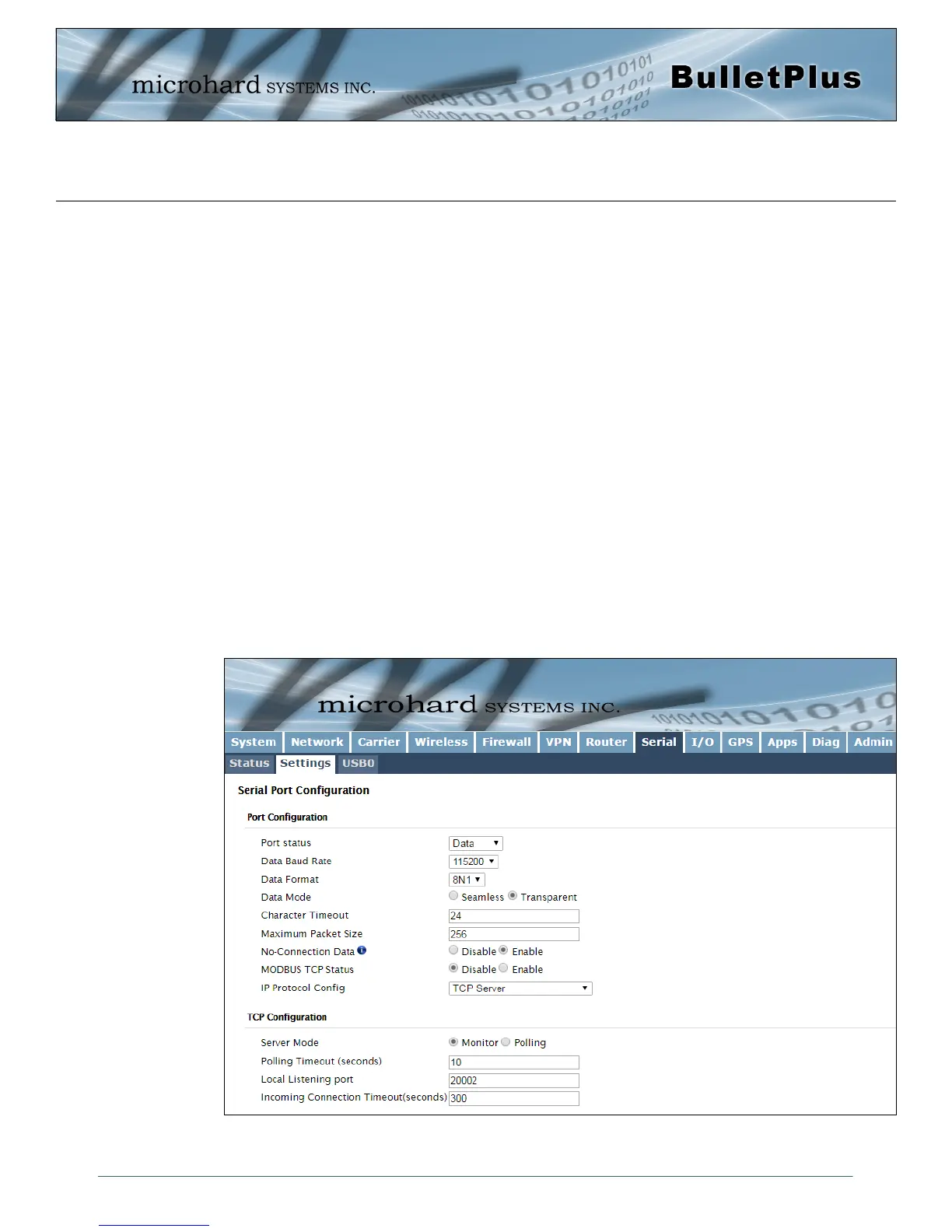 The USB ports support basic TCP/UDP serial port settings are discussed for the RS232 serial port.