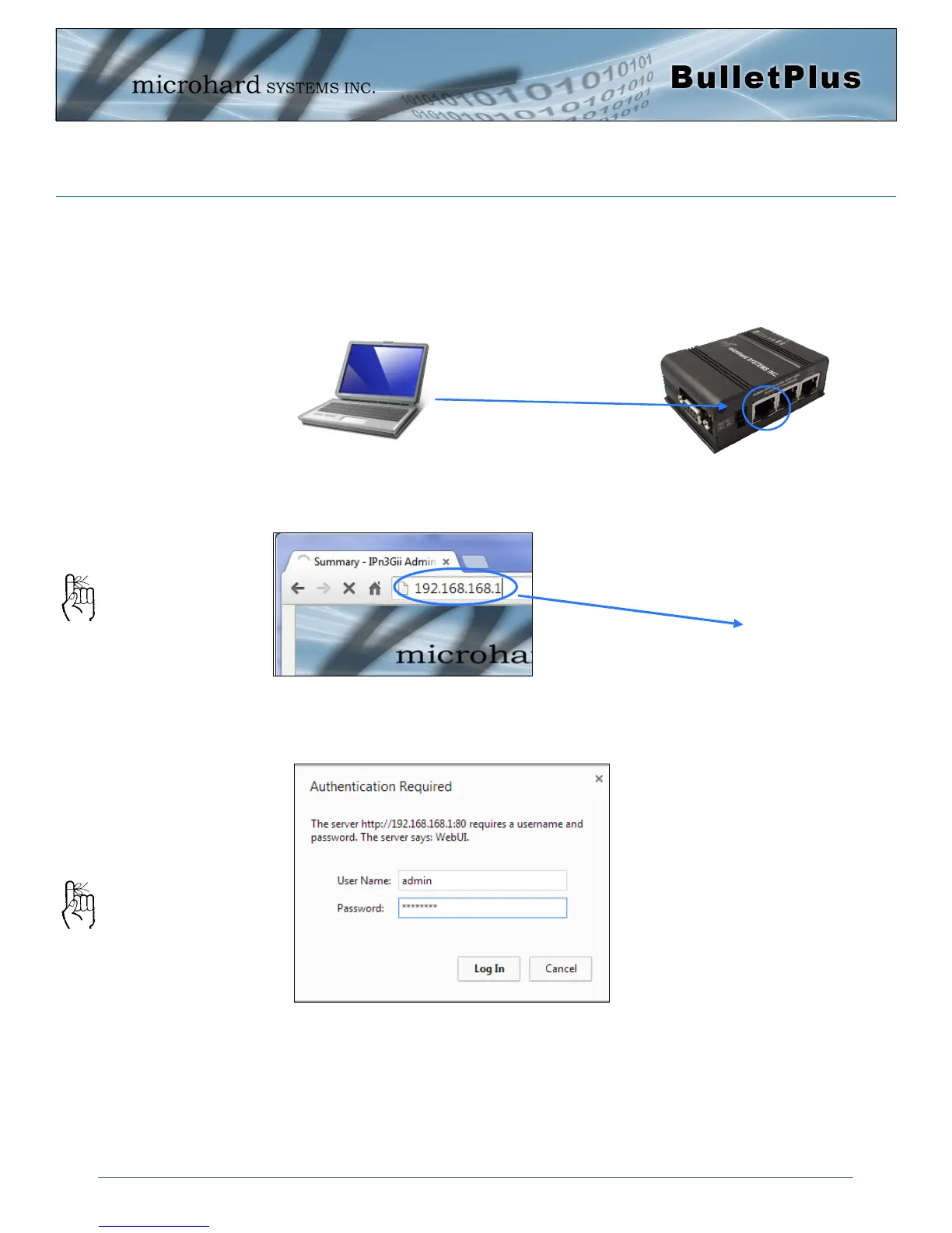 The BulletPlus will then ask for a Username and Password. Enter the factory defaults listed