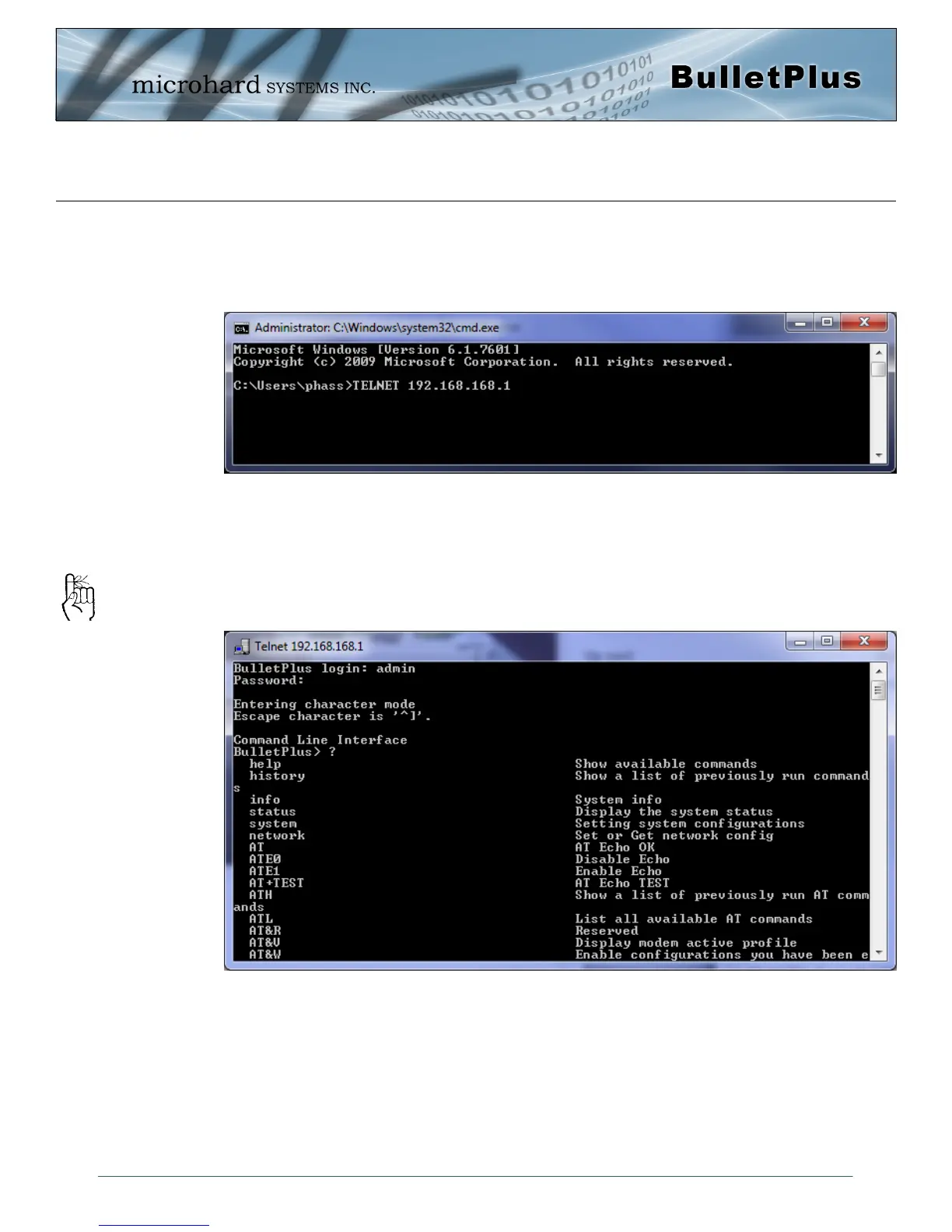 Telnet can be used to access the AT Command interface of the BulletPlus. The default port is TCP Port 23.