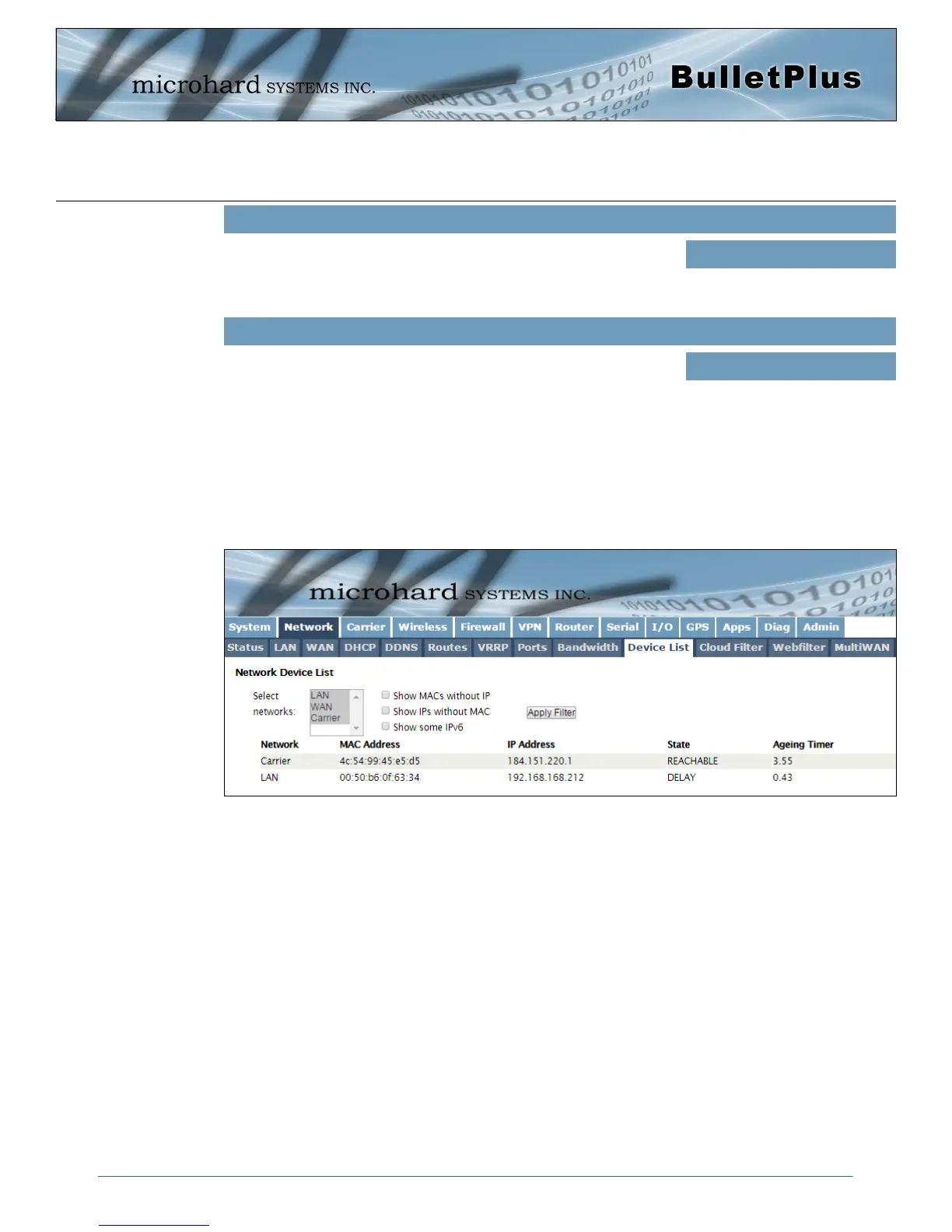 The Network > Device List shows the current ARP table for the network adapters. The MAC address and