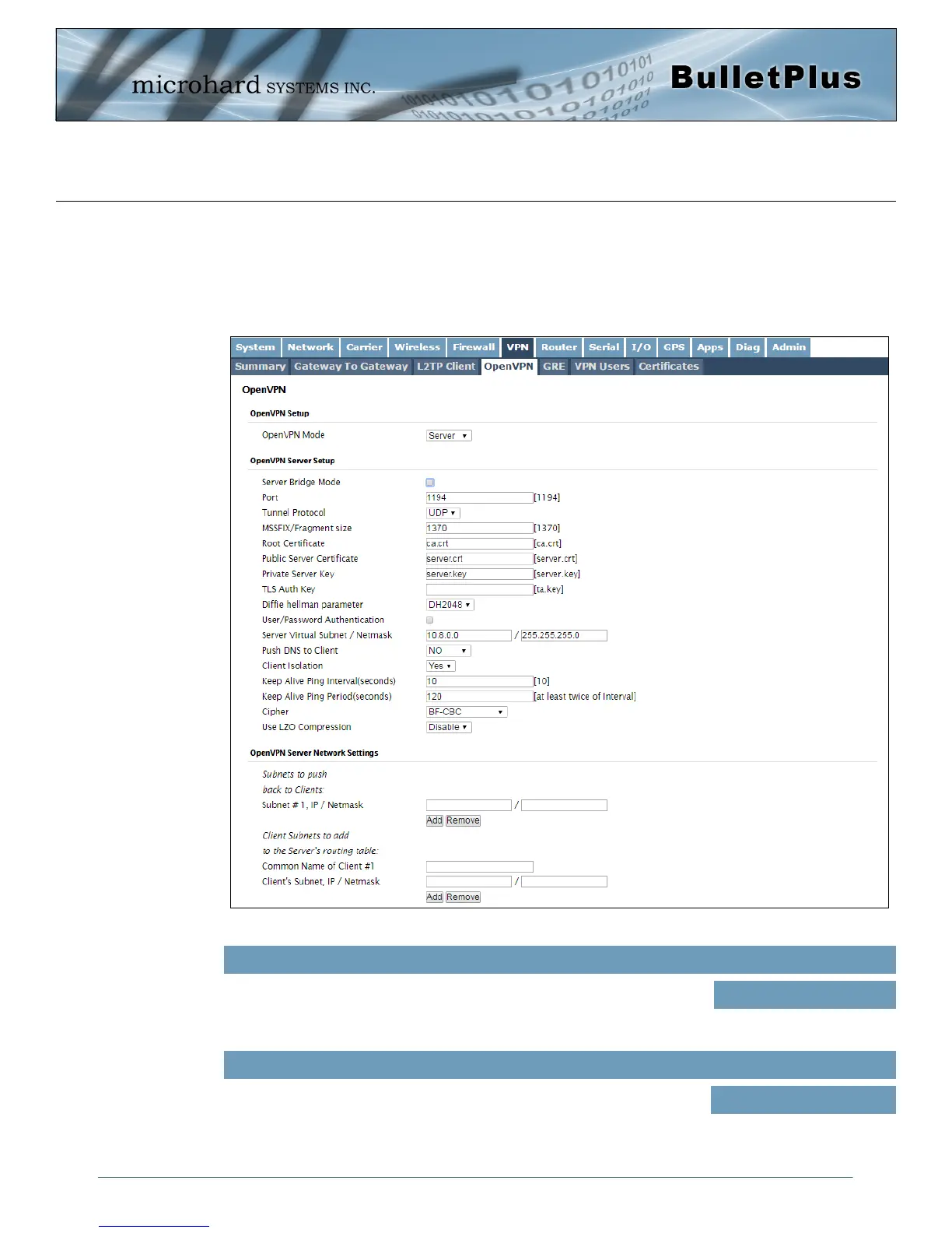 The BulletPlus supports OpenVPN and can be configured as a Server or a Client. This section outlines the