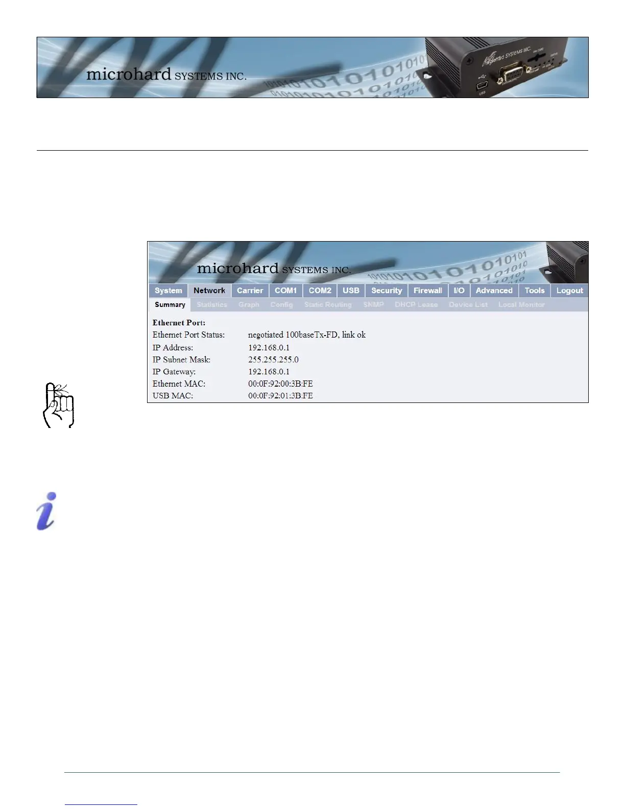 The Network > Summary tab gives an overview of the configuration of the Ethernet port on the IPn3G. This
