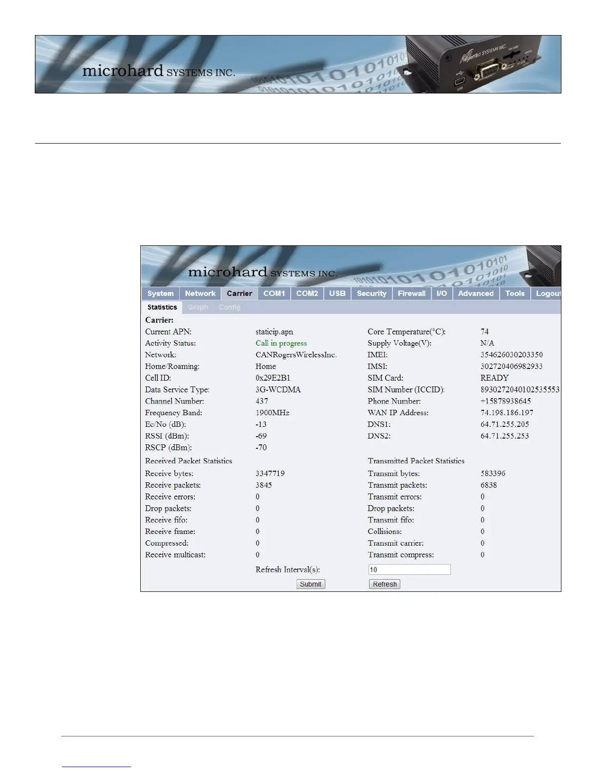 The Carrier Statistics window provides information related to the Wireless Carrier portion of the IPn3G. A