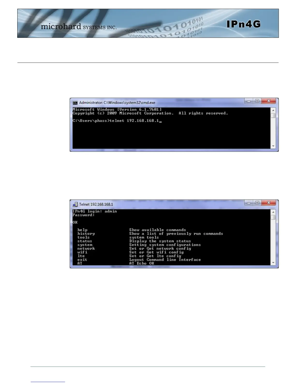 Telnet can be used to access the AT Command interface of the IPn4G. The default port is TCP Port 23. A