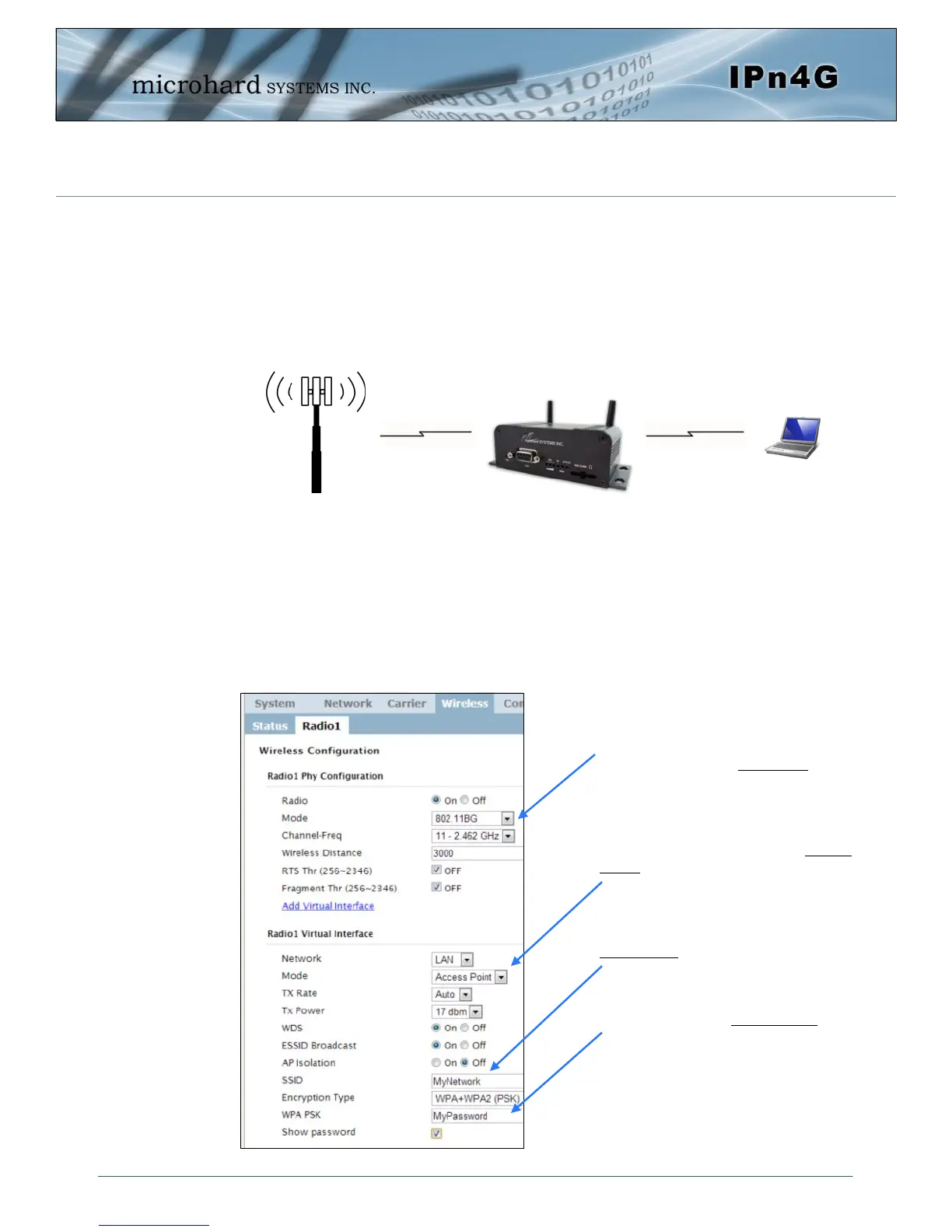 Click on the Wireless > Radio1 Tab to setup the WiFi portion of the IPn4G.