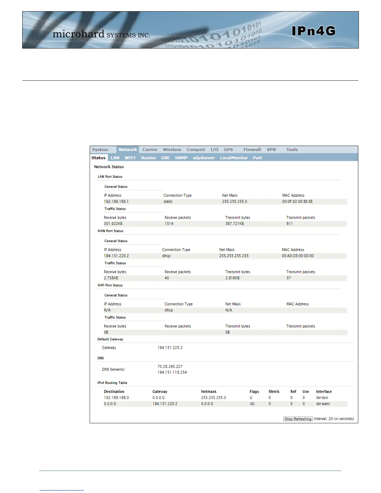 including the Connection Type (Static/DHCP), IP Address, Net Mask, Default Gateway, DNS,