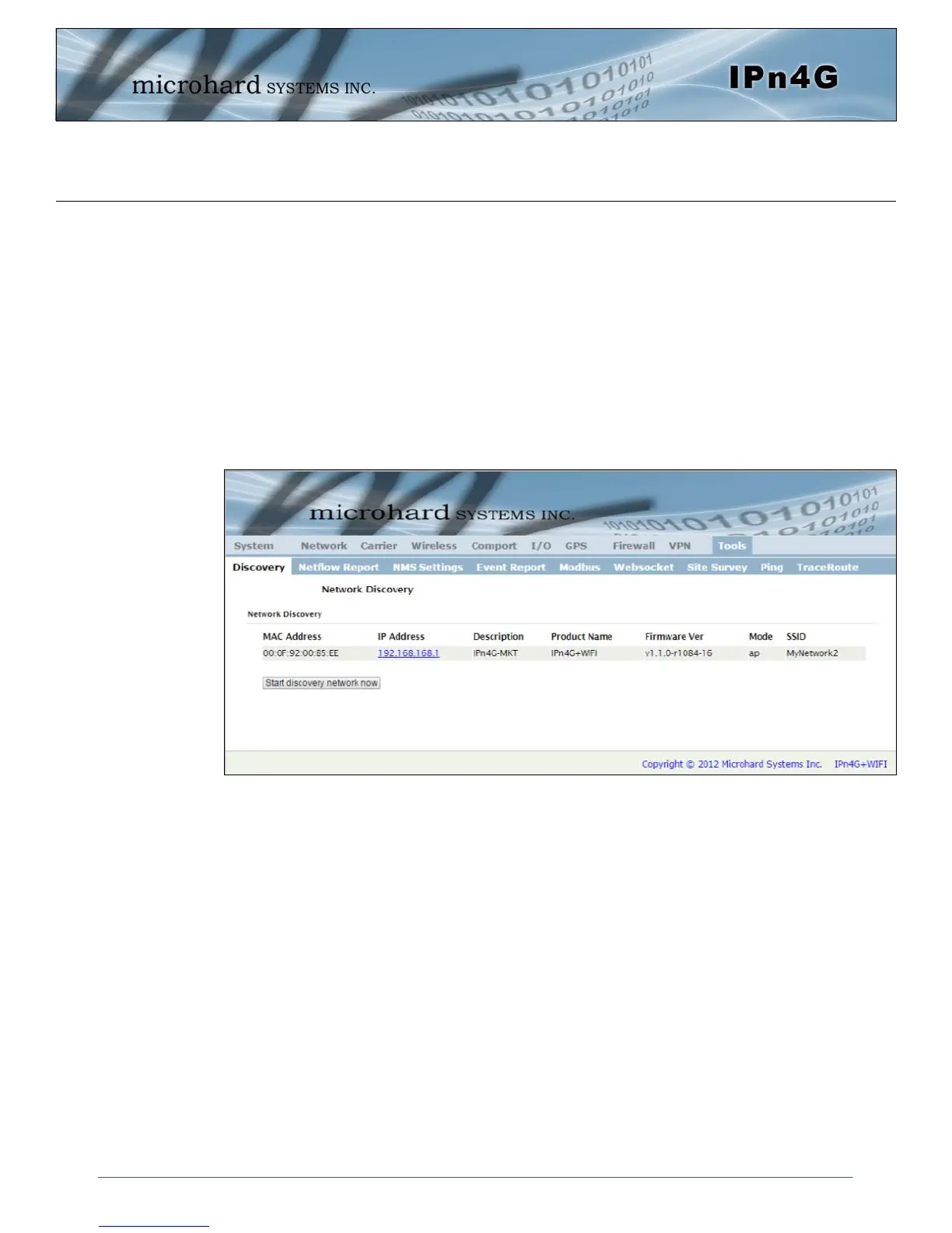 The Network discovery tool allows the IPn4G to send a broadcast to all Microhard Devices on the same