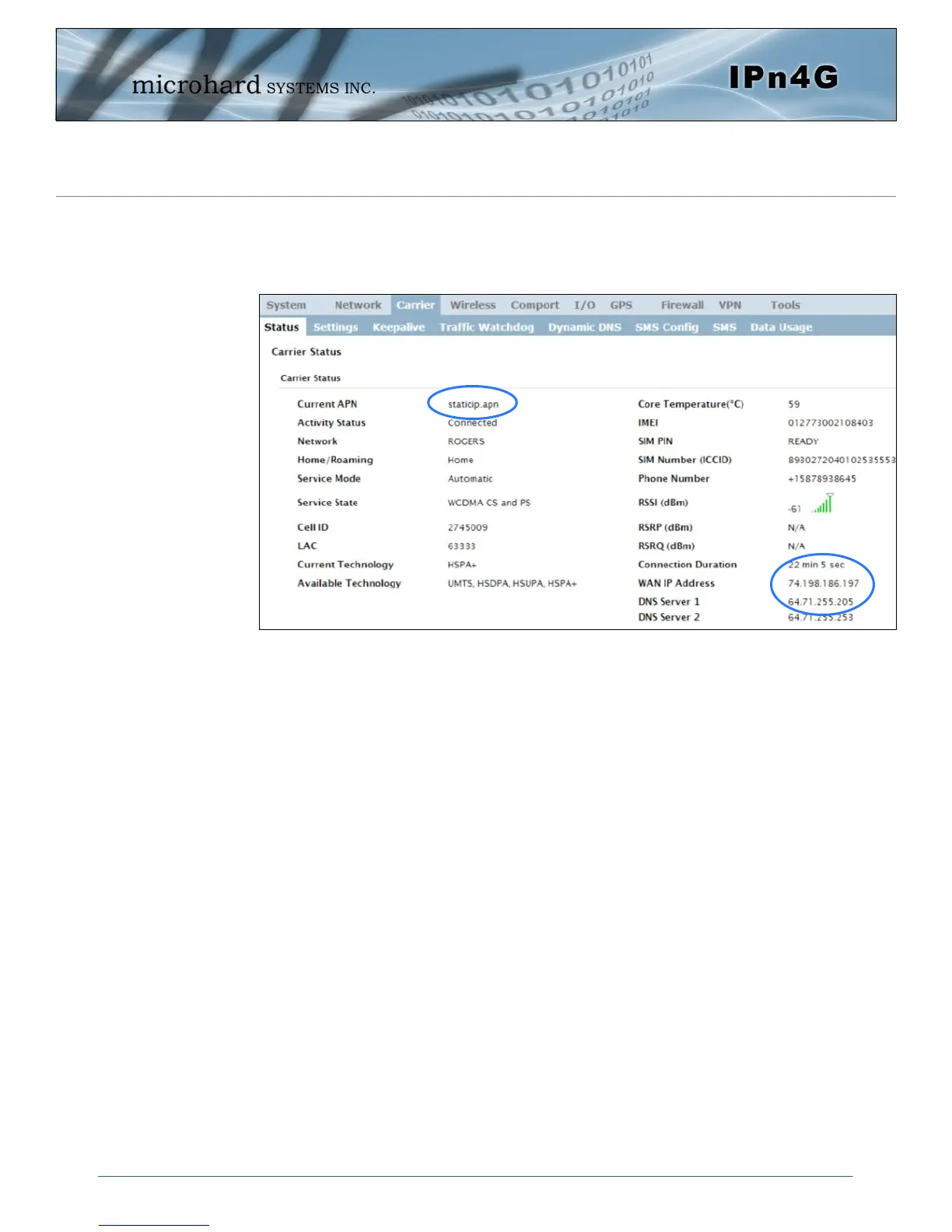 On the Carrier > Status Tab, verify that a WAN IP Address has been assigned by