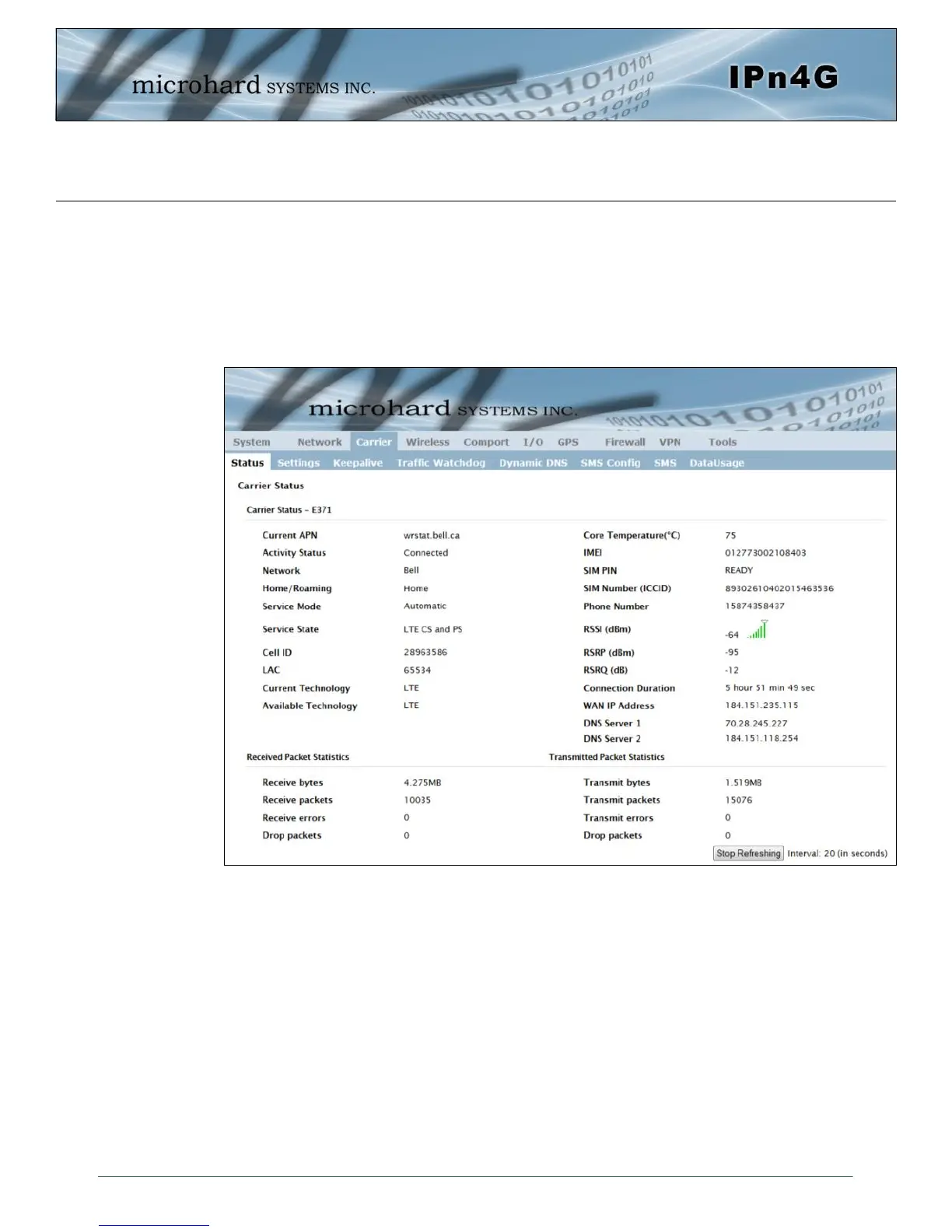 Microhard Systems IPN4GB - Carrier Configuration; Cellular Connection Status and Settings