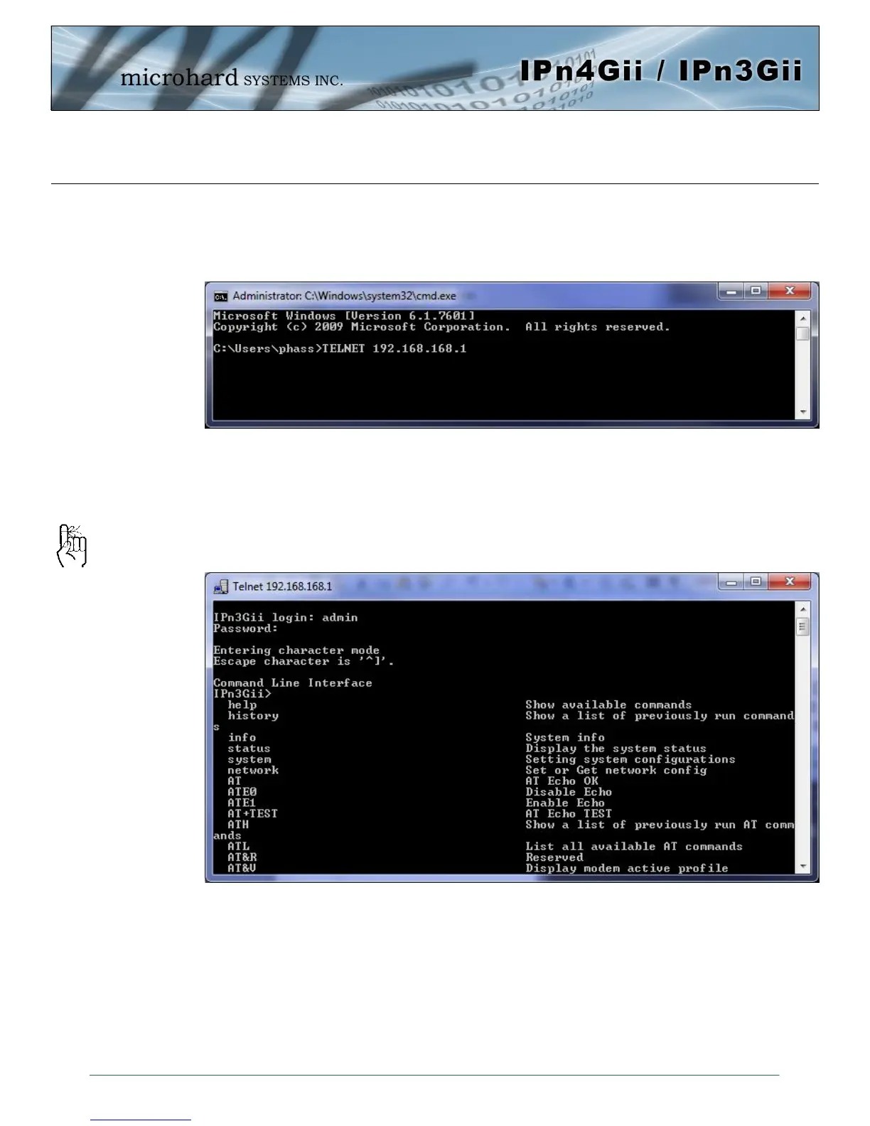 Telnet can be used to access the AT Command interface of the IPnXGii. The default port is TCP Port 23. A