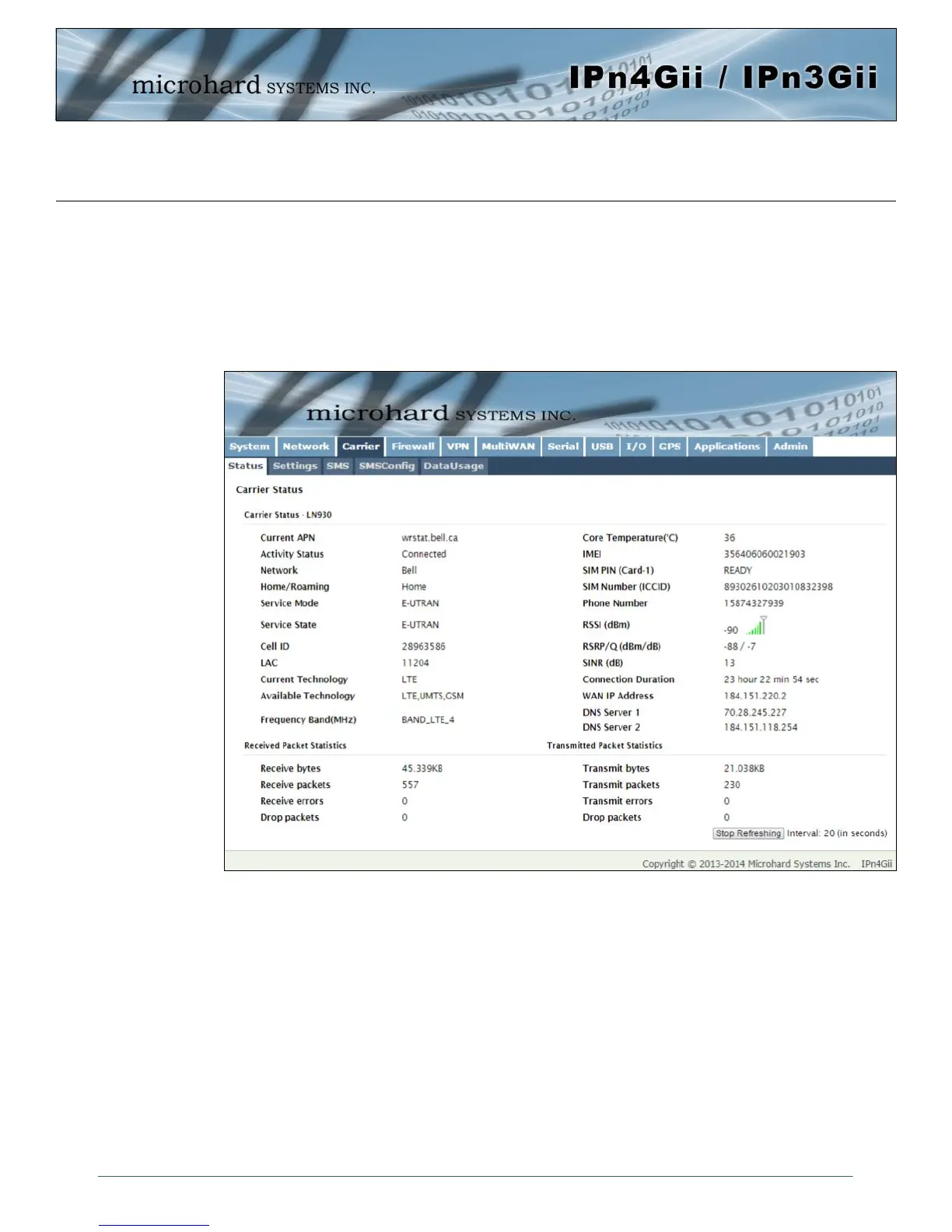 The Carrier Status window provides complete overview information related to the Cellular Carrier portion of