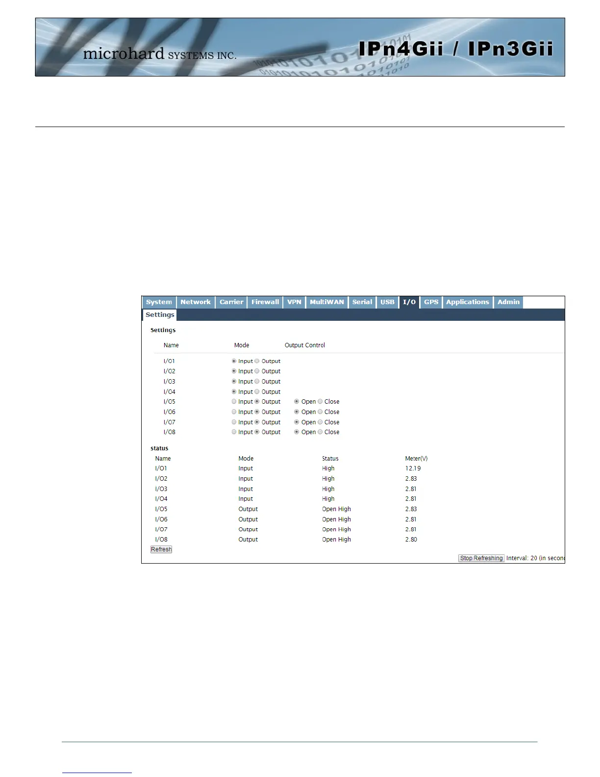 The Status section will display the current state and measured voltage (Meter) of any I/O’s configured as