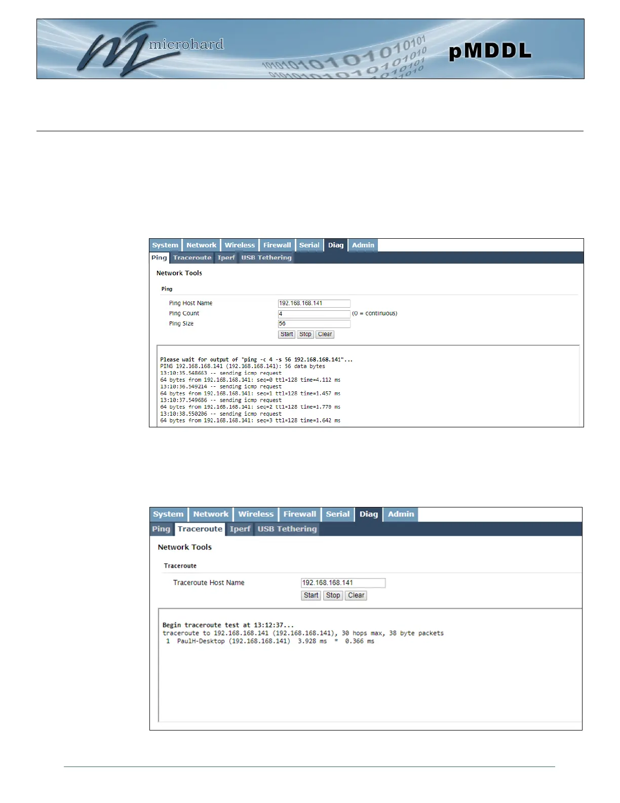 The Network Tools Ping feature provides a tool to test network connectivity from within the pMDDL unit. A