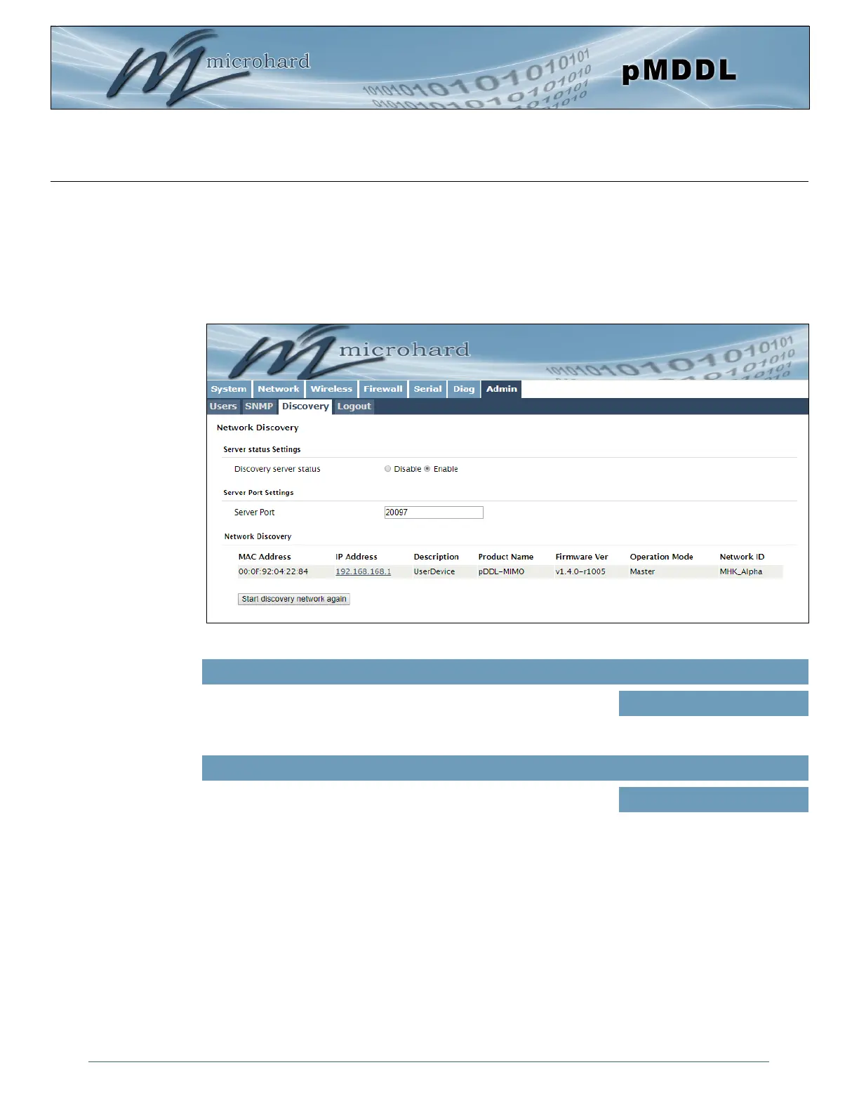 The Network discovery tool allows the pMDDL to send a broadcast to all Microhard devices on the same