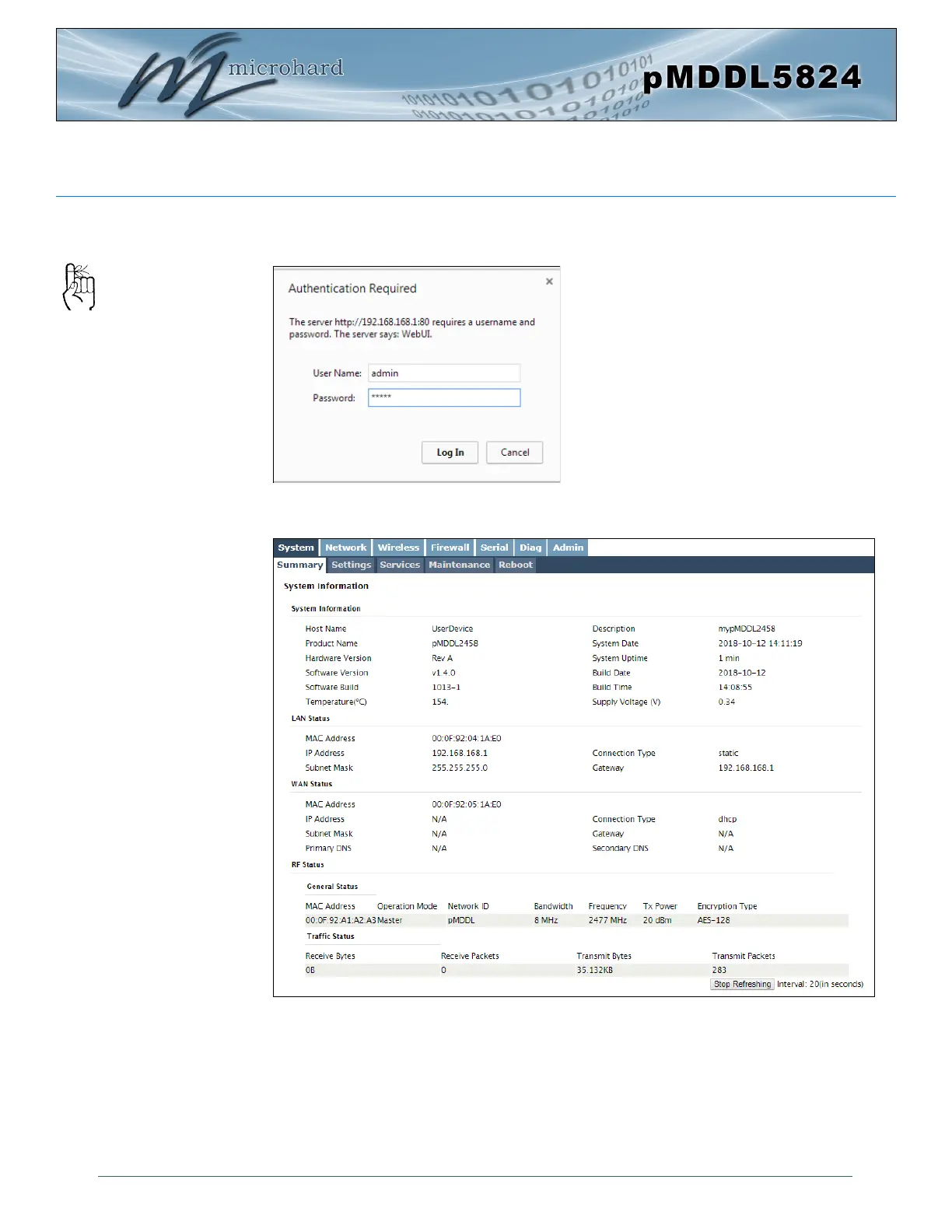 ✓ The pMDDL5824 will then ask for a Username and Password. Enter the factory