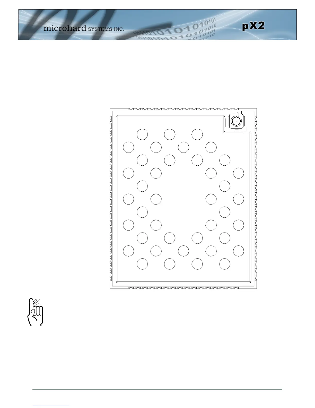 The above drawing depicts a top view of the pX2 OEM Module. The corner pads (1, 25, 41,