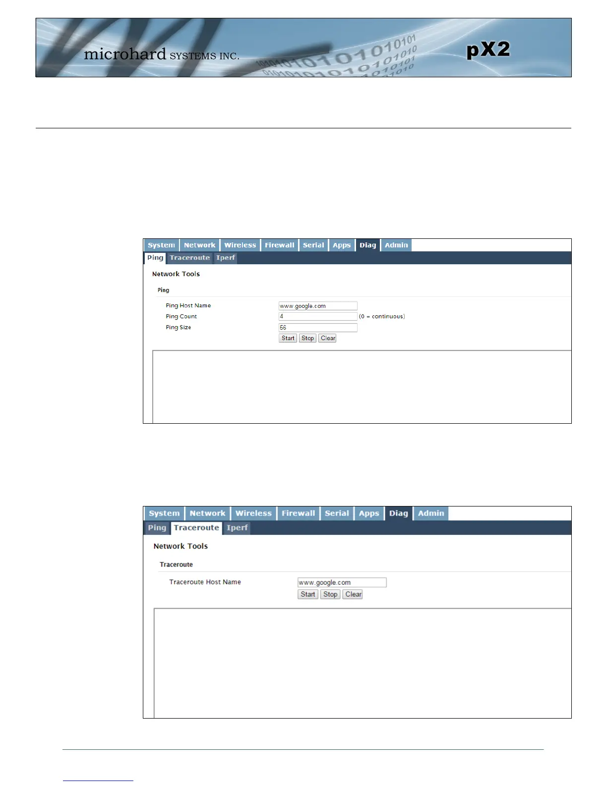 The Network Tools Ping feature provides a tool to test network connectivity from within the pX2 unit. A user