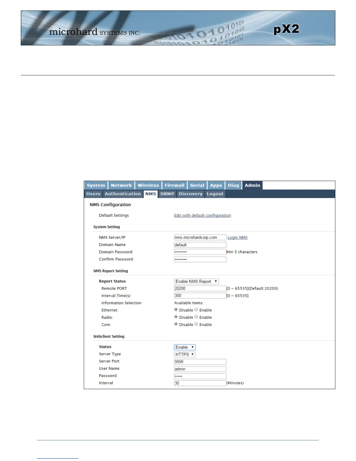 Once NMS has been configured, each pX2 must be configured to report into NMS.