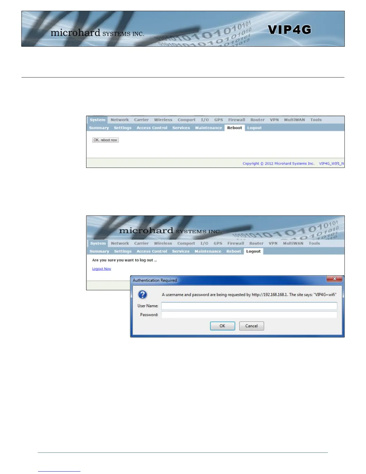 The VIP4G can be remotely rebooted using the System > Reboot menu. As seen below a button ‘OK,