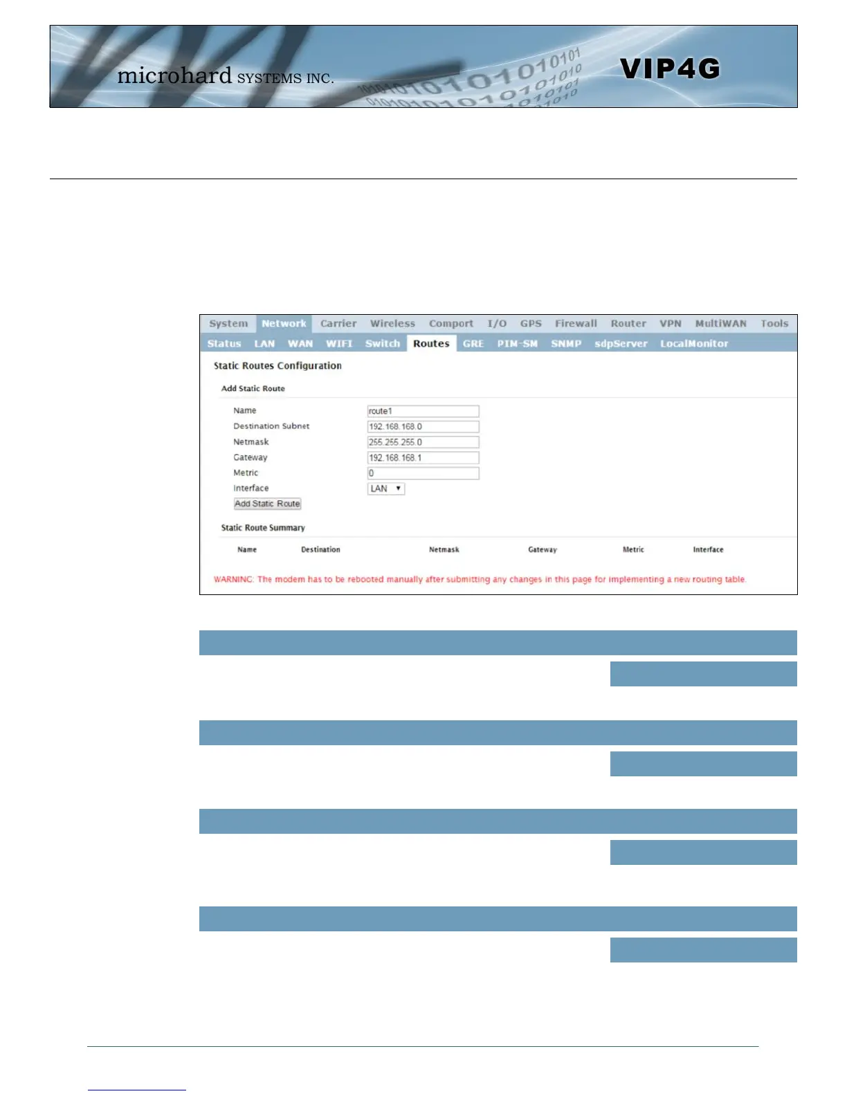 accomplished by specifying a static route, telling the VIP4G where to send data. The modem must be