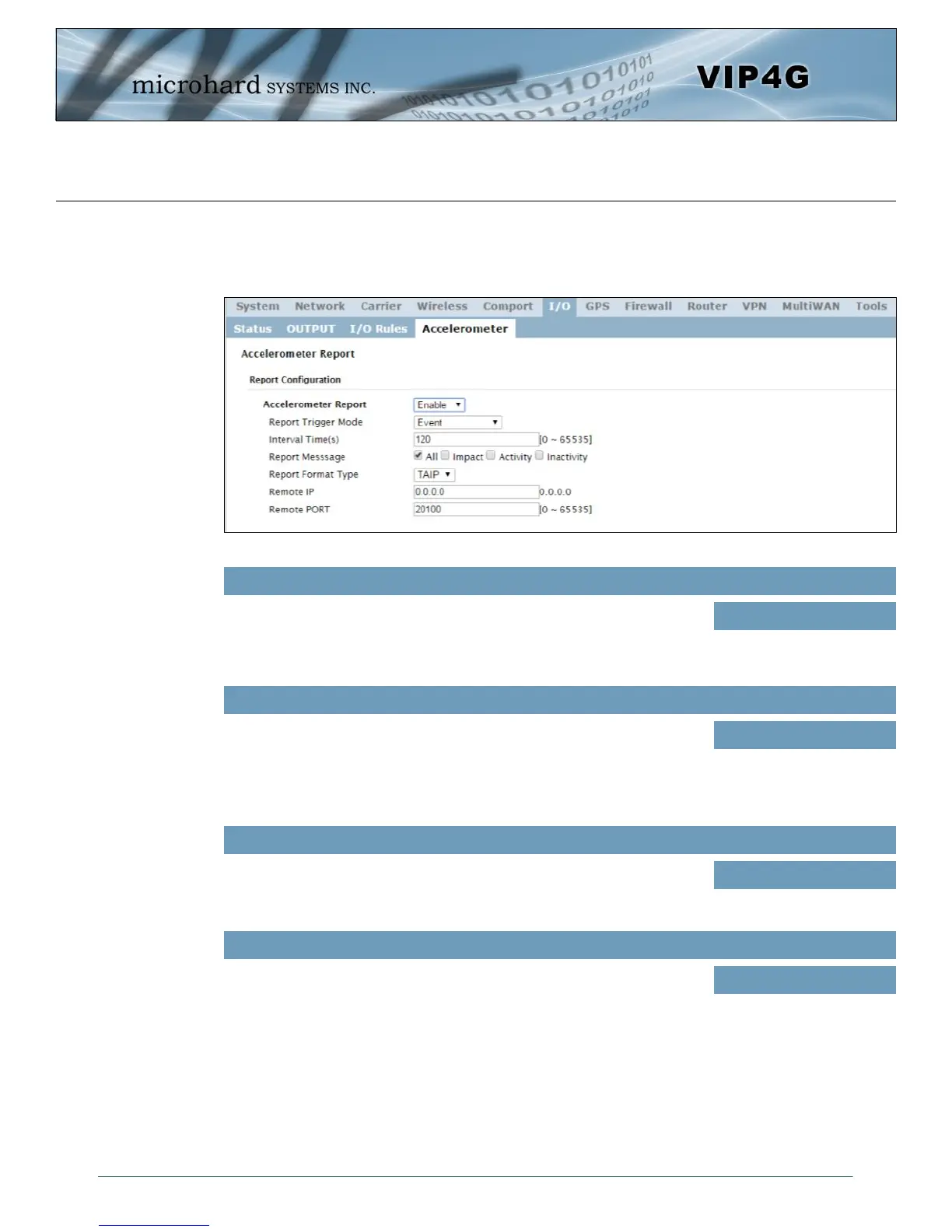 The VIP4G has a internal Accelerometer, which can be configured to report events to a remote host based
