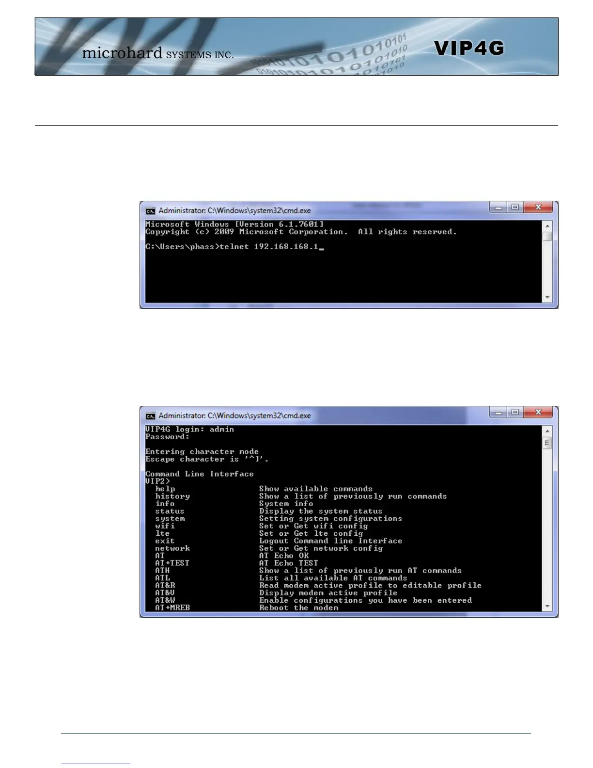 Telnet can be used to access the AT Command interface of the VIP4G. The default port is TCP Port 23. A