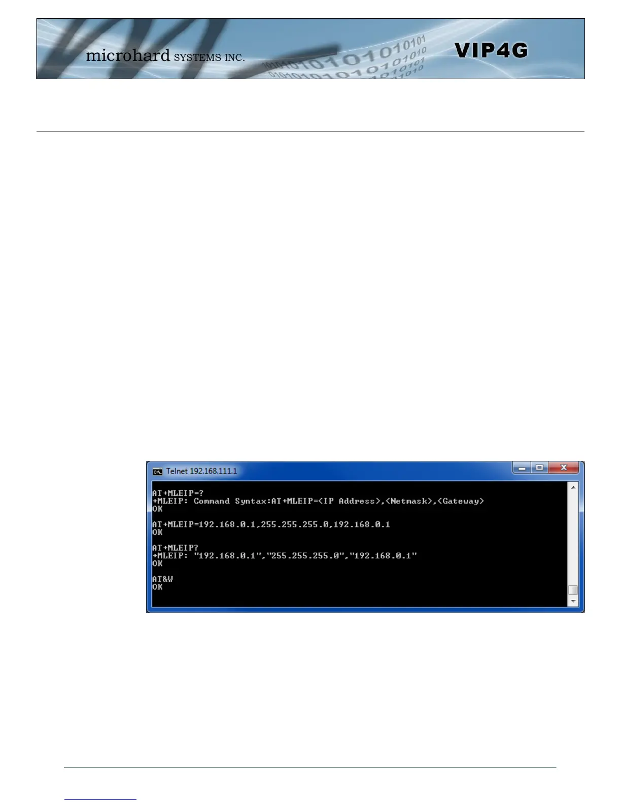 +MLEIP: Command Syntax:AT+MLEIP=<IP Address>,<Netmask>,<Gateway>