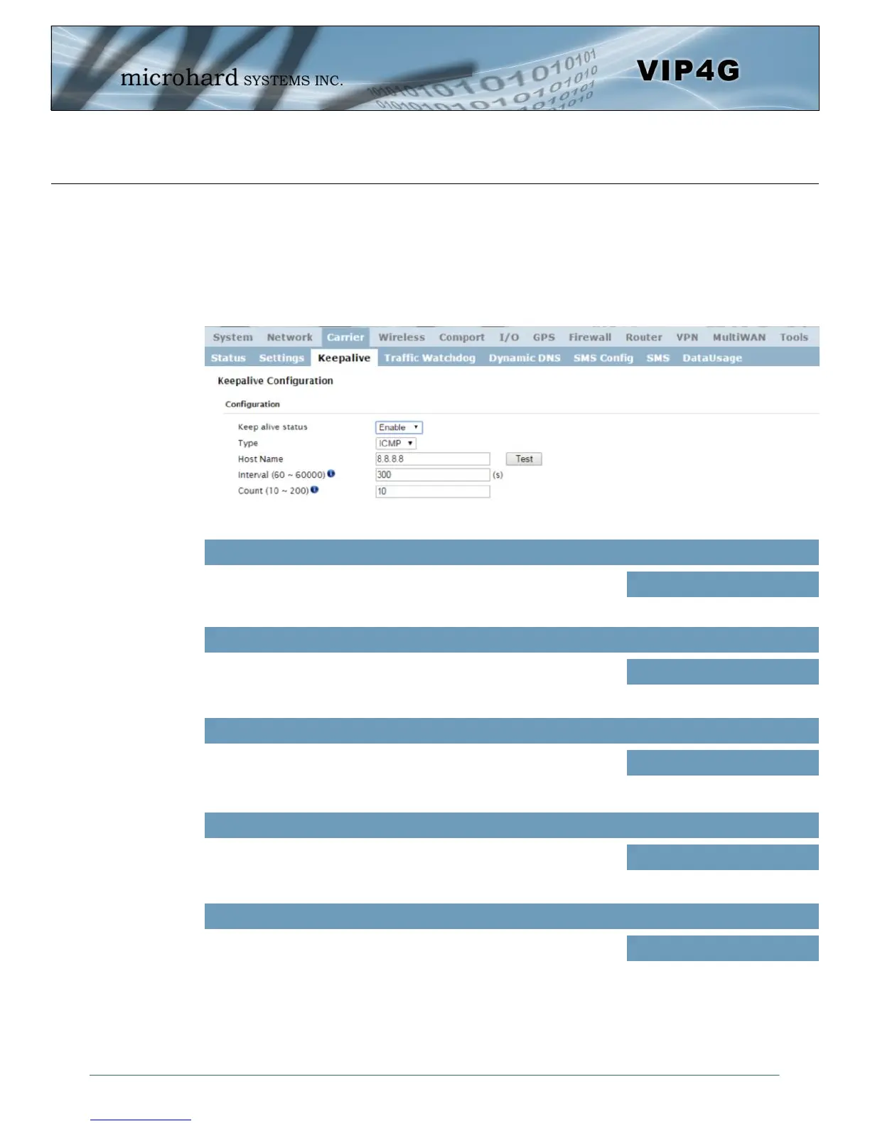 The Keep alive tab allows for the configuration of the keep alive features of the VIP4G. The VIP4G can